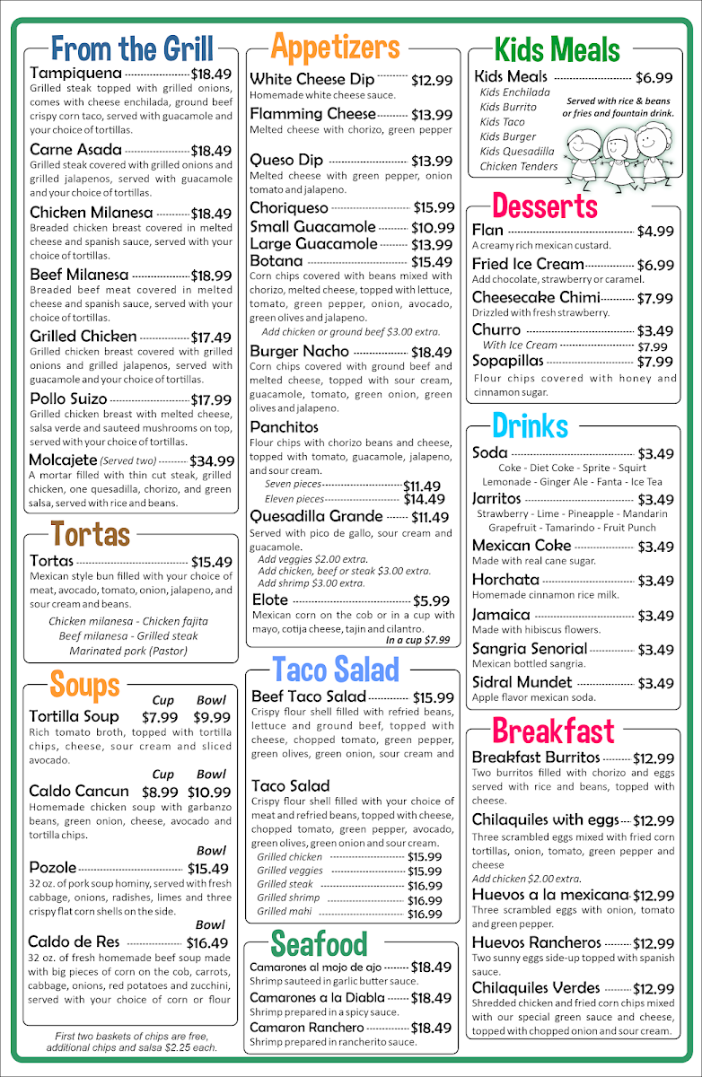 Grilled meat with onions and peppers, served with guacamole, rice and beans and your choice of tortilla. Grilled chicken 22.99 Grilled steak 24.99 Grilled shrimp 24.99 Grilled mahi 24.99 Grilled veggies 20.99 Add cheese 2.00 extra.